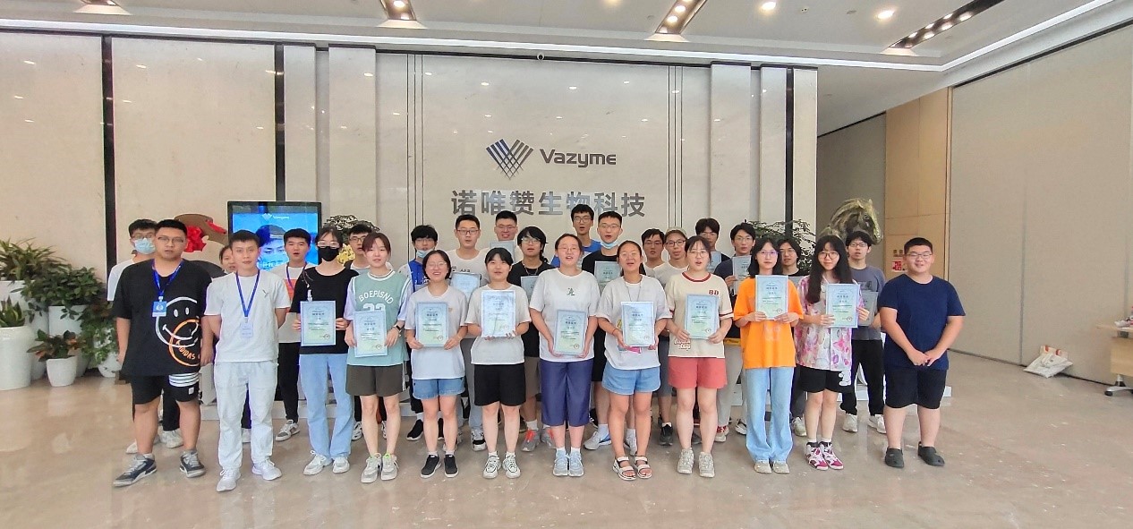 2022年7月9日,在菁英班班主任刘园园和“诺唯赞项目”专业指导教师谢彦杰的带领下,太阳官网菁英班同学前往南京诺唯赞生物科技股份有限公司总部开展实践实习。从2017年太阳官网与诺唯赞建立实践教学基地以来,“菁英班”每年前往诺唯赞总部实习,太阳官网谢彦杰教授均全程陪同前往指导实习实践学习。