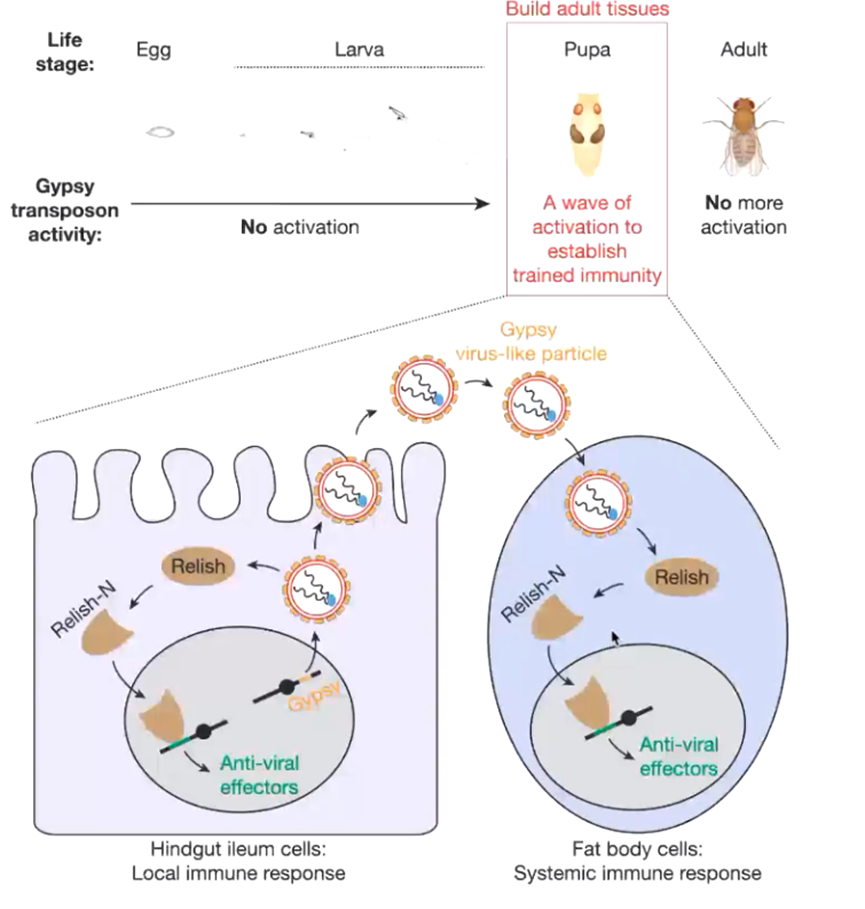 《The arms race between hosts and retrotransposons: from making fly eggs to anti-viral response (and more)》讲座中,王老师首先由转座子之母Barbara McClintock对于玉米斑纹的研究开启了今天的主题可调控元件——转座子,并引出含有30%转座丰度的模式生物果蝇,介绍了逆转座子、DNA转座子两种转座子类型,以及逆转座子LTR、Alu(SINE)、LINE-1的转座机制。随后,王老师讲述了piRNA pathway特异高效地识别并沉默转座子mRNA活性,并设计转录报告基因,结合阳性对照和阴性对照,在单细胞水平上进一步研究转座子在转座水平的活性,探索了I-element、ago3&aub转座子,证实了转座子mRNA在卵母细胞中通过微管系统富集,还研究了转座子在胚胎发育果蝇蛹时期中与Gypsy有关的重要作用,介绍了果蝇抗病毒的RNAi pathway、Toll pathway、IMD-Relish pathway以及STING-Relish pathway,得出转座子与宿主之间相互作用的结论。本次讲座帮助同学们拓宽了科研视野,增进了科研素养,现场同学们收获颇丰。